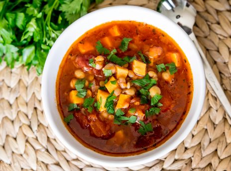 Jajka w sosie pomidorowym z soczewicą i jarmużem